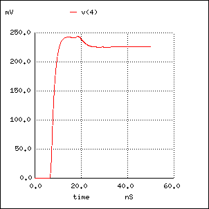 この反射がどの程度のものか、図1の回路と典型値の組み合わせで 出力インピーダンス 50Ωの方形波発信器の出力を観測するケースを spiceでシミュレートしてみた結果が図2です。(注3)