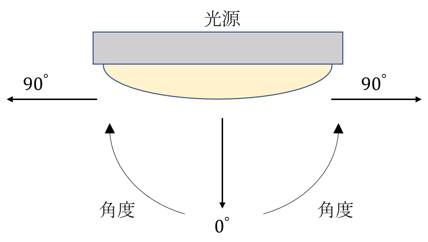 LED照明器具各社の配光曲線を参照すると、基本的にLEDを点光源とみなした際に出される配光に近く、およそ、その座標の原点にLEDを置いたことによる、配光曲線を持っています。図1にLED光源の測定方法の概略図、図2に配光測定曲線の例を示します。
